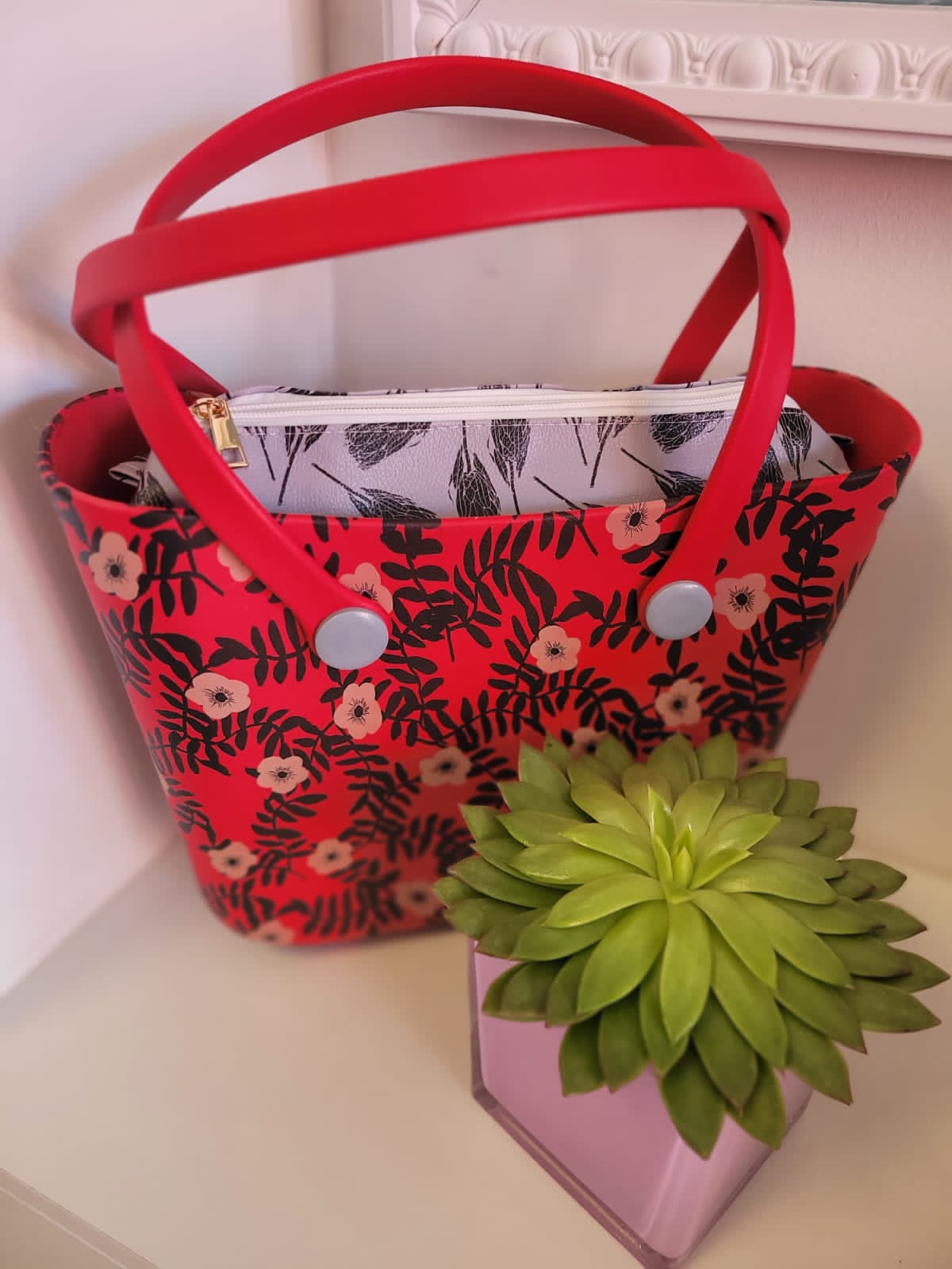 Medium size jelly bag in red, black and beige floral print